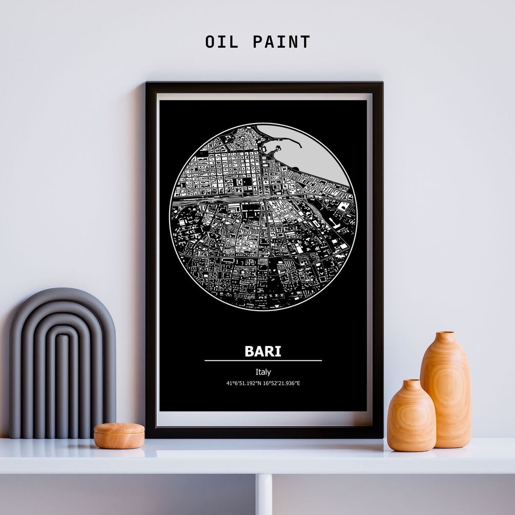 Crafted with precision using professional cartography software, our map print boasts exceptional resolution and intricate details. Whether you're a cartography enthusiast, a traveler with fond memories of Bari, or simply seeking contemporary wall art, this print is sure to captivate.