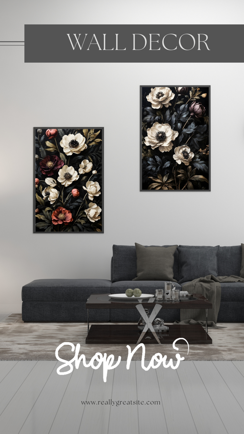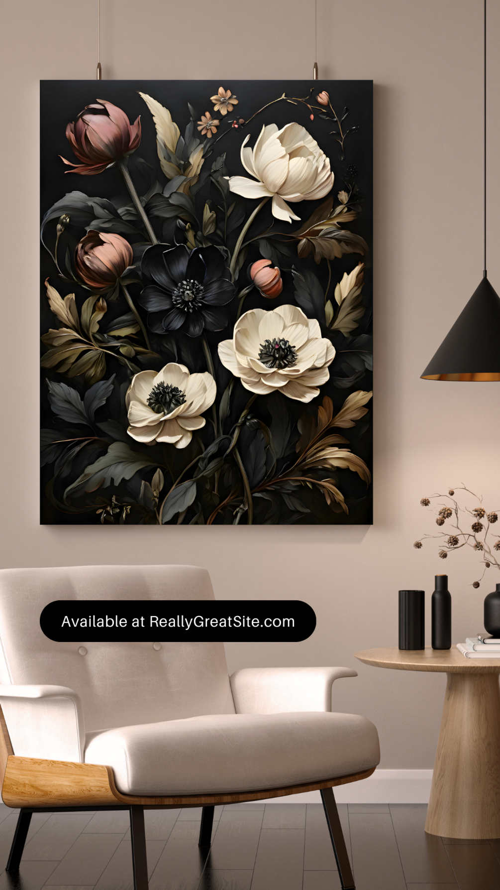 Designed for versatility, these digital prints allow you to effortlessly transform any room into a sanctuary of elegance. Whether you prefer a statement piece or a subtle accent, the 'Midnight Bloom' collection offers a range of options to suit your taste. Elevate your interior with the timeless beauty of vintage botanicals, reimagined in a contemporary context.