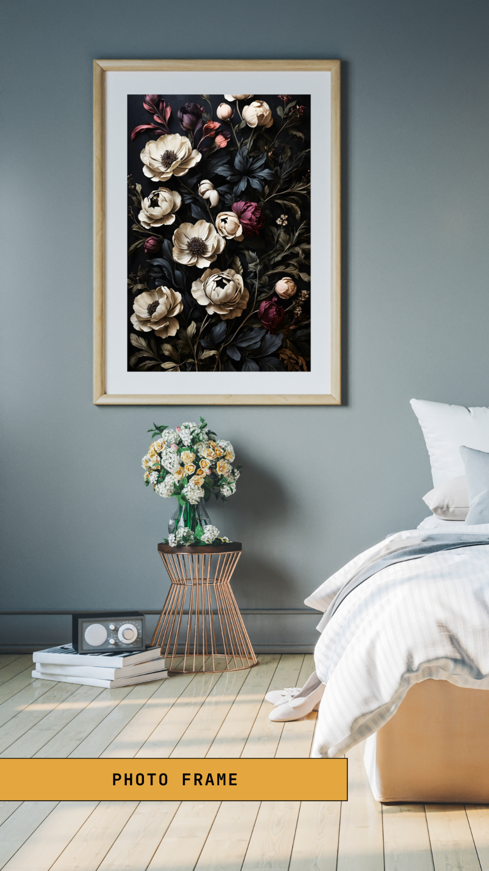 Designed for versatility, these digital prints allow you to effortlessly transform any room into a sanctuary of elegance. Whether you prefer a statement piece or a subtle accent, the 'Midnight Bloom' collection offers a range of options to suit your taste. Elevate your interior with the timeless beauty of vintage botanicals, reimagined in a contemporary context.